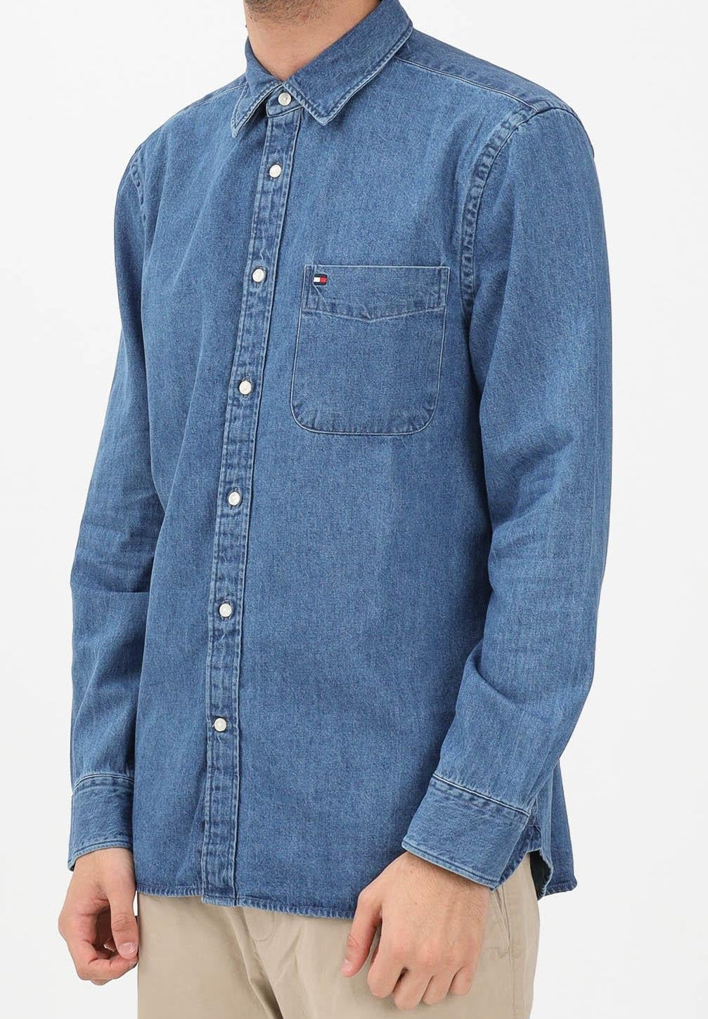 Camicia di jeans in denim medio da uomo con taglio classico e versatile. Caratterizzata dall'iconica bandierina ricamata Tommy Hilfiger, aggiunge un tocco grintoso e autentico a qualsiasi outfit. Perfetta per la stagione primavera-estate, si abbina facilmente con jeans, chino o shorts per uno stile casual raffinato. Il modello indossato è taglia L su una persona alta 187cm. Si consiglia il lavaggio e la stiratura a media temperatura per mantenere la qualità del denim nel tempo.